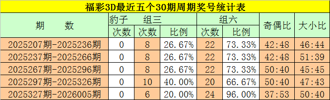在最近一个30期周期内(第2025327期-第2026005期),豹子奖号莫得出现,组三奖号开出了6次,所占比例为24%,组六奖号共出现24期,开出比例为96%,组六号码邻接出现12期,默契相称活跃,本期预测奖号为组六号码。